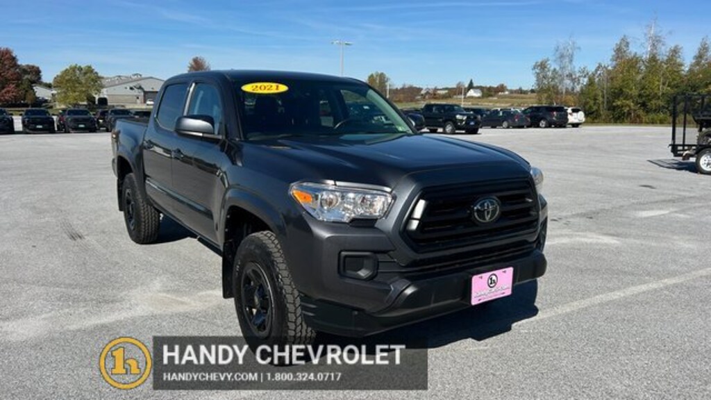 Handy Chevrolet is proud to present you with another True Market Priced Pre-Owned Vehicle. Transparent Pricing Of $ 32508 !! This 2021 Toyota Tacoma SR V6 is loaded with the following Factory Options: 4WD, ABS brakes, Active Cruise Control, Electronic Stability Control, Front dual zone A/C, Illuminated entry, Low tire pressure warning, and Traction control 4WD, ABS brakes, Active Cruise Control, Electronic Stability Control, Front dual zone A/C, Illuminated entry, Low tire pressure warning, Traction control, 6 Speakers, Air Conditioning, AM/FM radio: SiriusXM, AM/FM Stereo, Anti-whiplash front head restraints, Apple CarPlay/Android Auto, Auto High-beam Headlights, Automatic temperature control, Axle Ratio: 3.91, Brake assist, Bumpers: body-color, Driver door bin, Dual front impact airbags, Dual front side impact airbags, Emergency communication system: Safety Connect with 1-year trial, Exterior Parking Camera Rear, Fabric Seat Trim (FB), Front anti-roll bar, Front Bucket Seats, Front Center Armrest, Front reading lights, Front Seats, Front wheel independent suspension, Knee airbag, Occupant sensing airbag, Outside temperature display, Overhead airbag, Overhead console, Passenger door bin, Power door mirrors, Power steering, Power windows, Rear step bumper, Speed control, Speed-sensing steering, Split folding rear seat, Steering wheel mounted audio controls, Tachometer, Telescoping steering wheel, Tilt steering wheel, Variably intermittent wipers, and Wheels: 16 x 7J Style Steel Disc!!